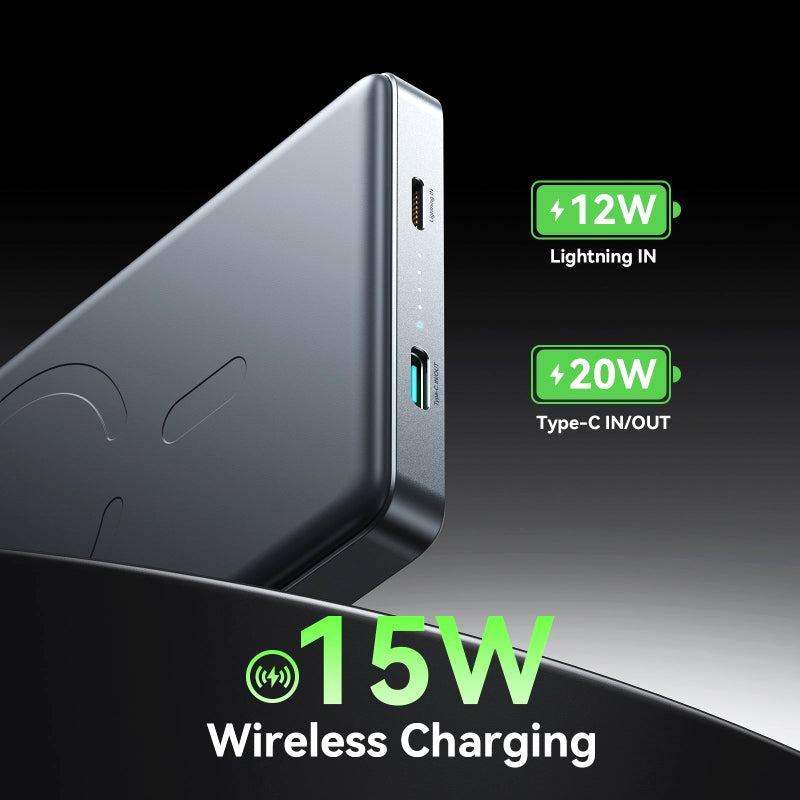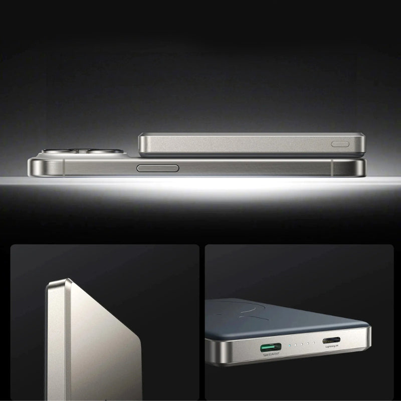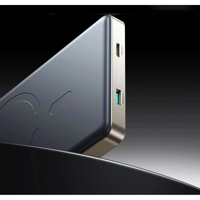 The Joyroom JR-PBM08 Pro is a premium 10,000mAh magnetic wireless power bank that combines sleek design with powerful performance. Featuring an ultra-thin aluminum alloy body (14mm thick) and a stylish titanium finish, this power bank is as elegant as it is durable. With 20W USB-C PD fast charging, 12W Lightning input, and 15W MagSafe-compatible wireless charging, it keeps your devices powered all day.