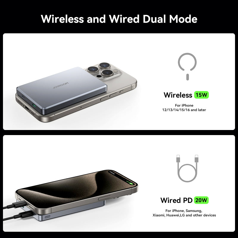 Perfect for travelers, the JR-PBM08 Pro meets airline safety standards and lets you charge two devices simultaneously (wired + wireless). It’s built-in LED indicator displays battery status, while the compact size (103x68x14mm, 176g) ensures portability. Whether you’re at work, on a flight, or outdoors, this power bank delivers fast, reliable power for iPhones, Android devices, and other USB-C/MagSafe-compatible gadgets.