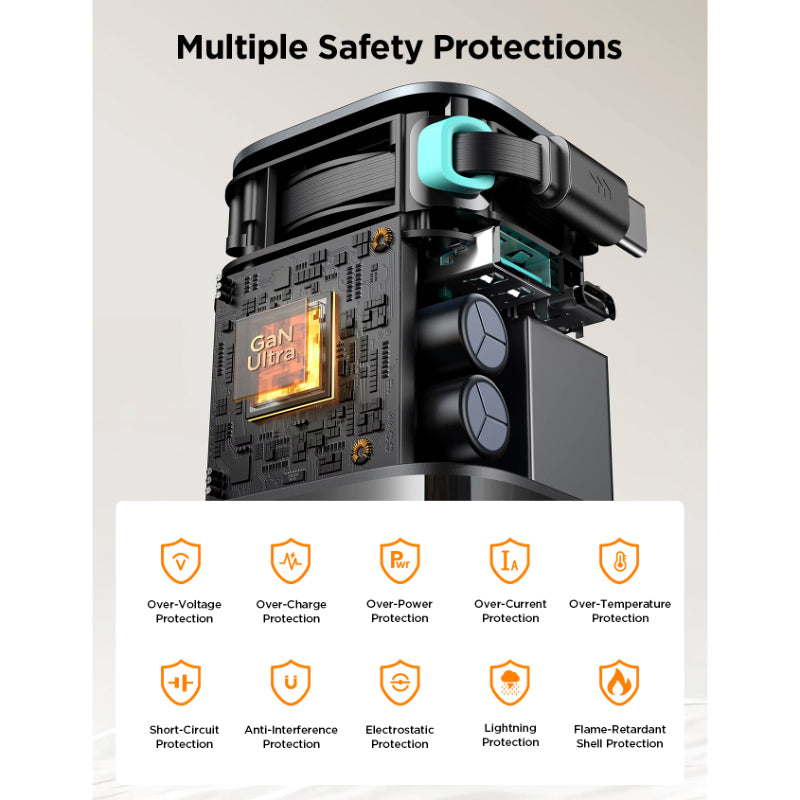 Supporting PD 3.0 fast charging, the 65W output allows full-speed charging for over 98% of laptops, smartphones, tablets, and other digital devices. The advanced protection system includes safeguards against overcurrent, over-voltage, over-temperature, and short circuits, ensuring safe and reliable charging.